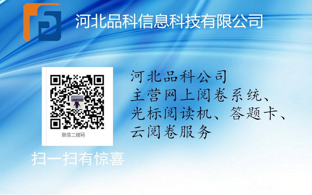 河北品科信息科技有限公司,是集生產、研發和銷售為一體的高科技企業,目前主要從事考試光標閱讀機、教學觸控一體機、網上閱卷系統和考試答題卡及其相關產品(機讀卡、軟件)的開發生產和銷售。